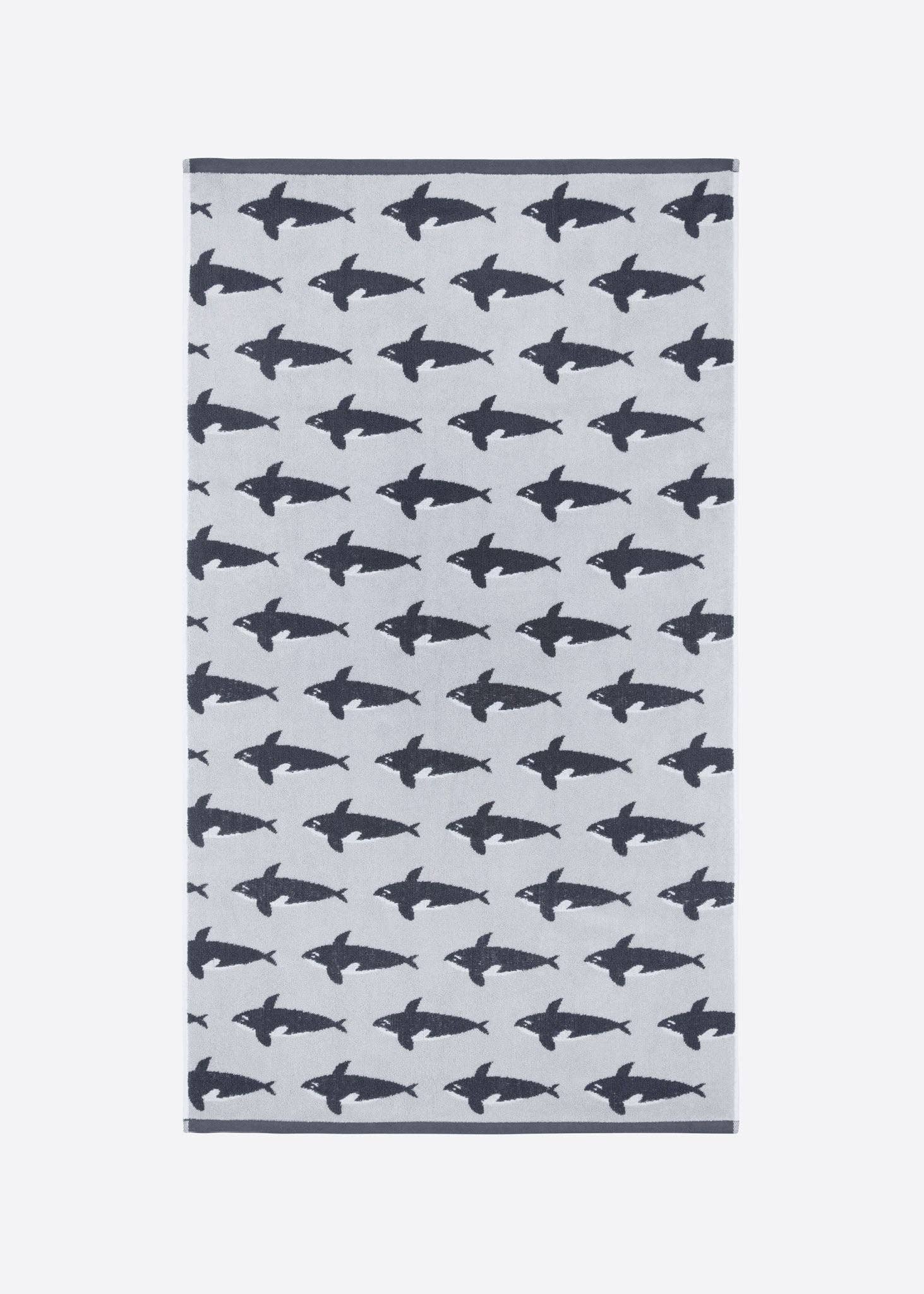 The soft, subtle tones of the Anorak Sea Life bath towel collection are designed to fit in perfectly with both modern and classic bathrooms. Inspired by the great outdoors and made from high quality, super soft 100% organic cotton, our Orca bathroom towels feature a simple monochrome Killer Whale pattern on a sophisticated light grey background and are available across all towel sizes from facecloth to bath sheet.