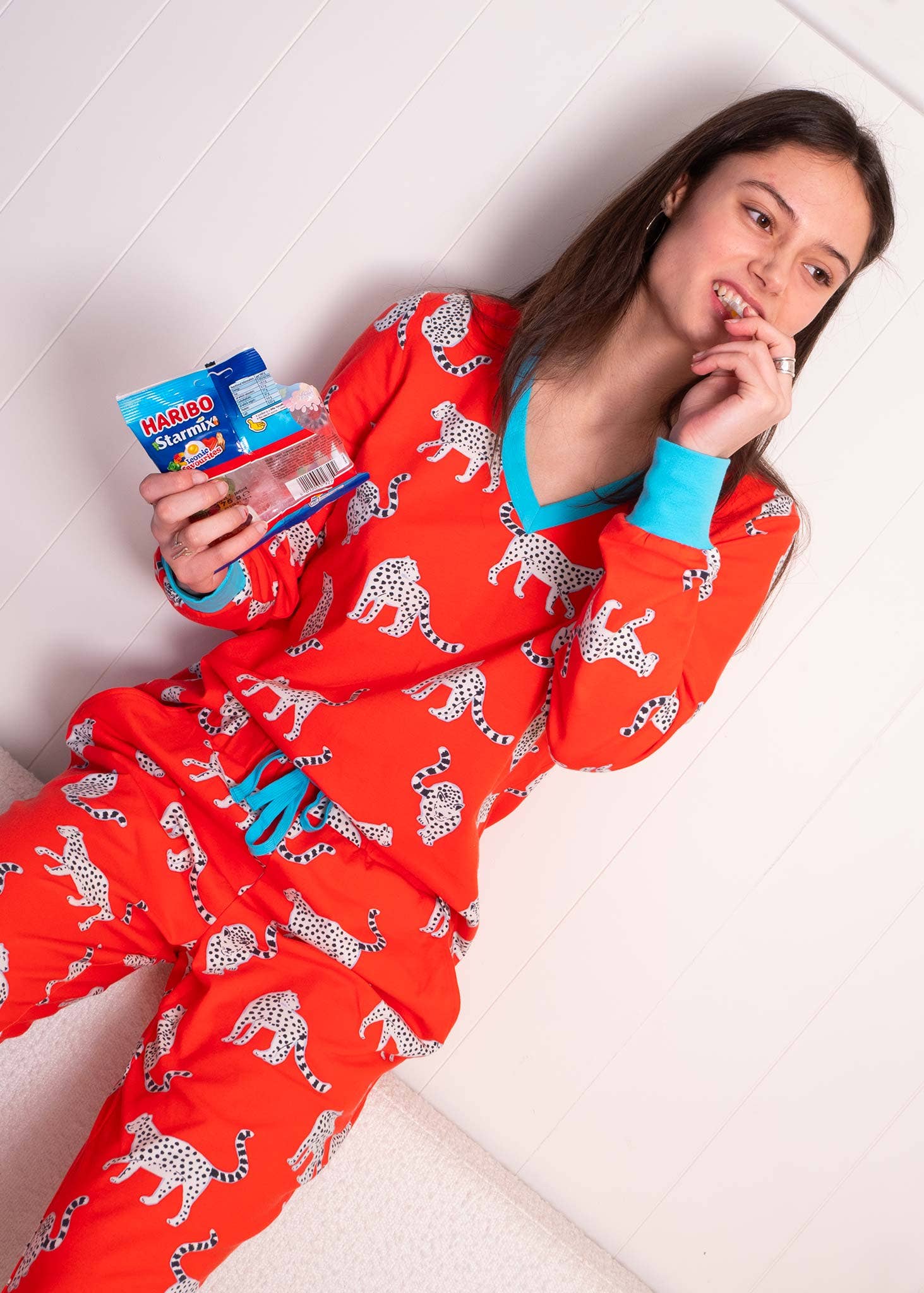 Our Snow Leopards jersey PJ's are perfect for both night and daytime lounging. Ethically sourced and lovingly crafted from 100% organic cotton, they're super soft and good for the planet. Featuring stylish snow leopards on a hot coral ground, useful side pockets and contrasting rib detailing.