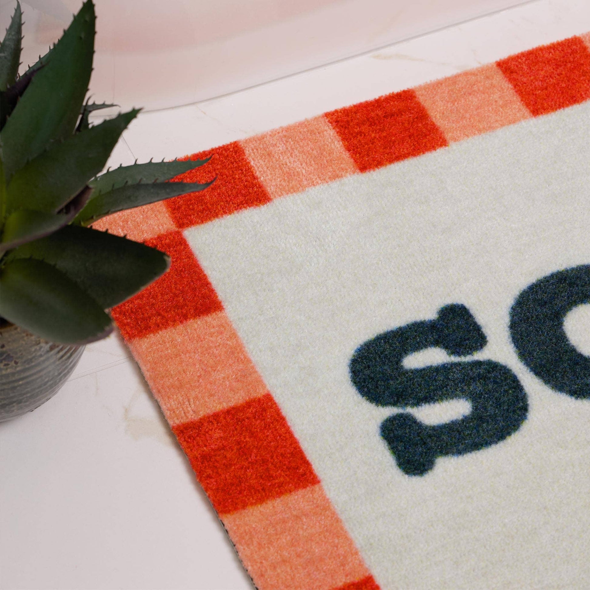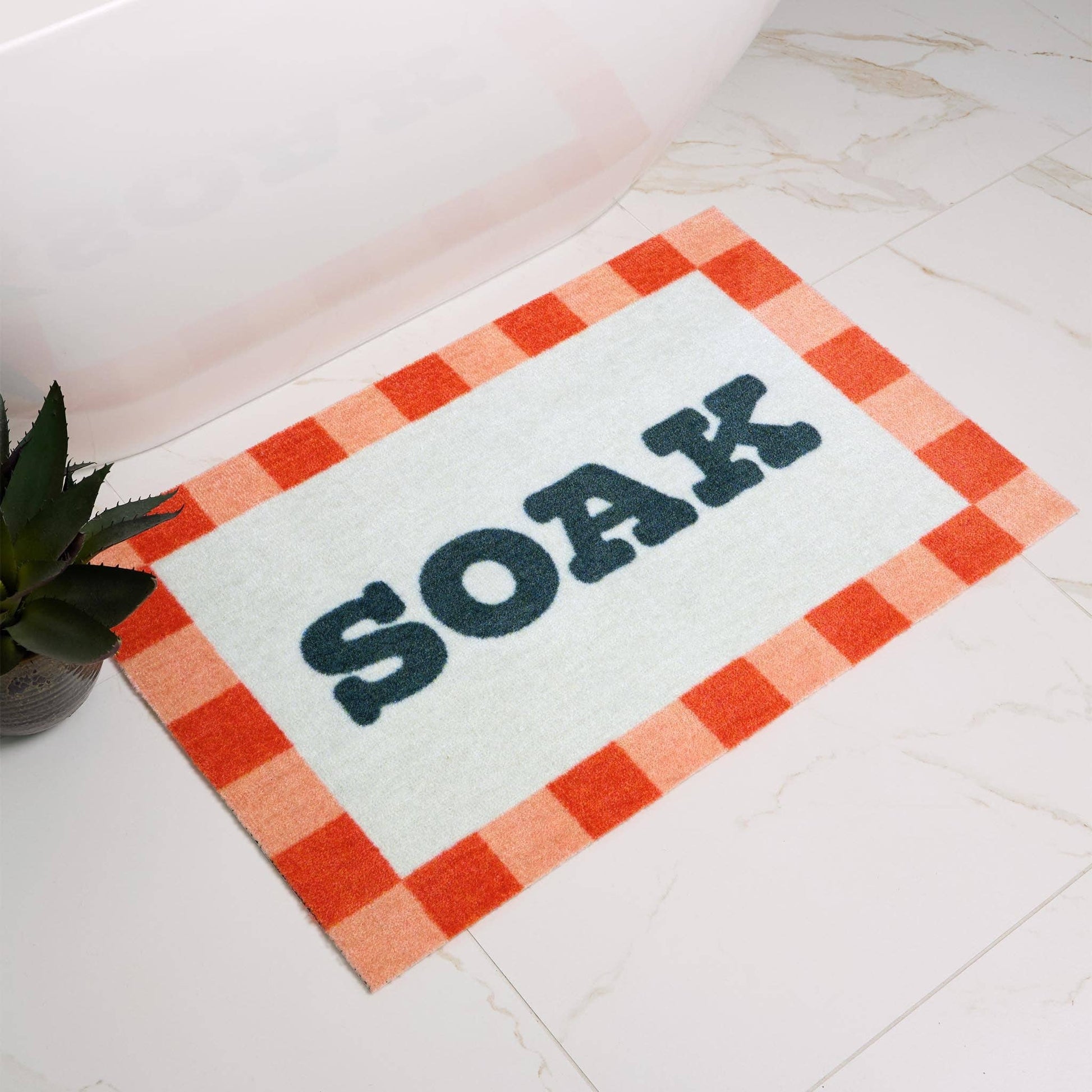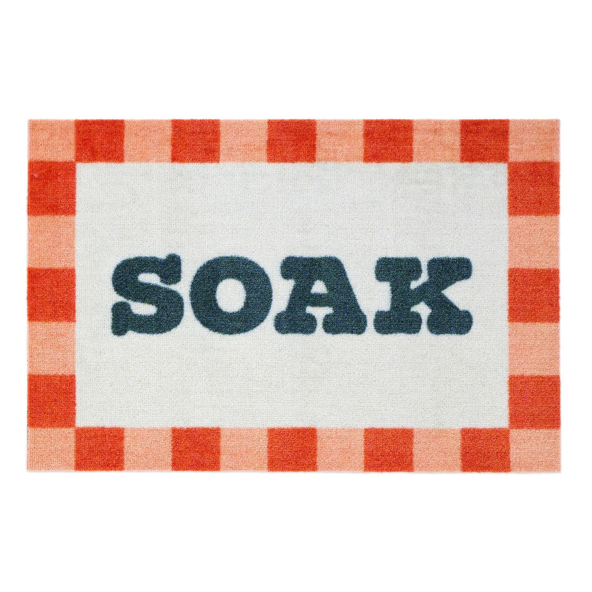 Fresh, fun and stand out Ð bring bold energy to your bathroom with our eye-catching colour combinations! A fun collaboration of retro and modern design, our Soak bathmat features a dark green "Soak" surrounded by an orange tile inspired border.
